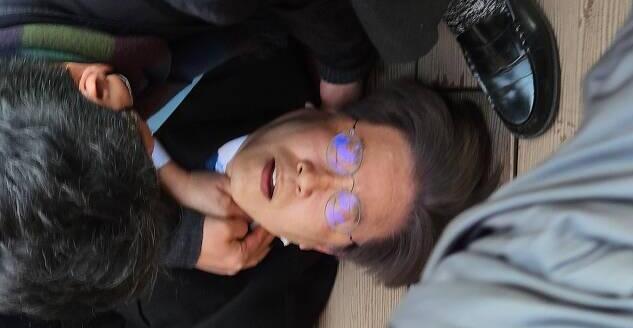 新闻画面显示,李在明的左侧颈部被袭击流血,躺在地上,眼里含着泪水。目前尚不知具体伤情严重程度。