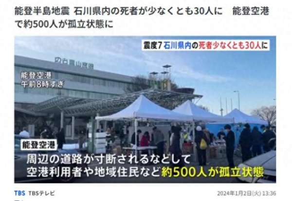 据报道,包括机场使用者和当地居民在内累计约500人,目前被困于轮岛市能登机场,周围道路被切断。