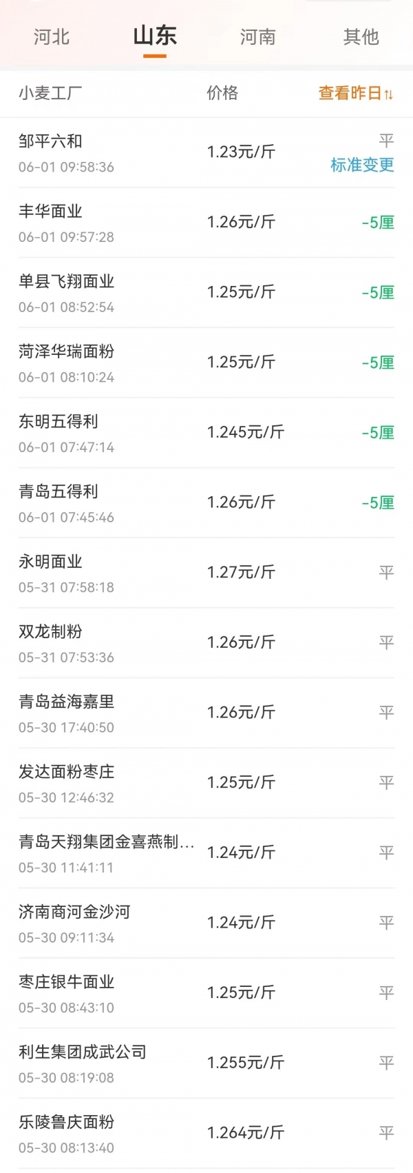 从机构数据了解,山东地区,制粉企业报价大范围下跌,德州发达面粉、丰华面业、临沂五得利、济宁利生、梁山利生、东明五得利以及华统面业等,小麦价格下跌0.5~2分,山东小麦报价跌至1.21~1.245元/斤左右,主流报价跌至1.22~1.23元/斤!