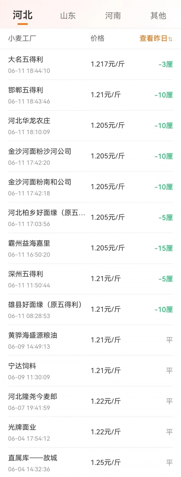 河北地区,大名五得利、邯郸五得利、华龙农庄、河北金沙河、霸州益海嘉里以及深州五得利等,主流小麦落价0.5~1.5分,小麦价格普遍跌至1.205~1.22元/斤左右!