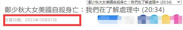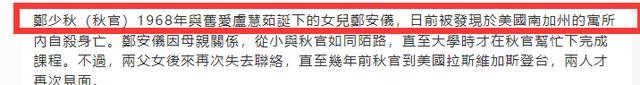 10月1号晚,港媒传出悲痛消息,郑少秋大女儿郑安仪不幸于美国上吊自杀,年约55岁。由于这一消息太突然,再加上郑少秋最为外界熟知的儿女只有郑欣宜以及与官晶华所生的两个女儿,所以这一消息让人疑窦丛生。