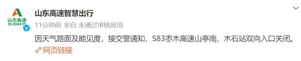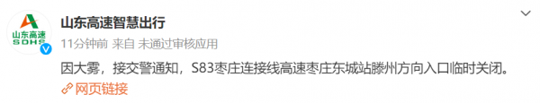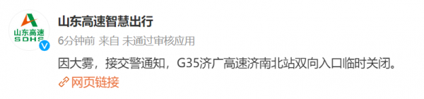 因大雾,接交警通知,G35济广高速长清、孝里、平阴、长清大学城站广州方向入口临时关闭。