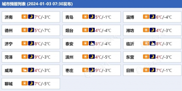 济南市气象台2024年1月3日06时发布的分县预报: 3日白天到夜间晴,早晨部分地区有雾或轻雾,南风2~3级逐步增强到4级阵风7级,最高气温7℃左右。