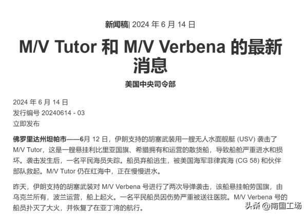 在6月14日,美国中央司令部公布了"导师"号遇袭的最新动态,实际上已经造成了一名水手"失踪",船员弃船逃生。船只在红海慢慢进水,就等着彻底沉了!所以,胡塞这次是真打成沉了,也是全球首次使用自杀小艇击沉商船的案例。