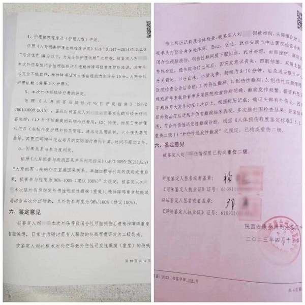 2023年7月7日,刘先生申请对儿子的精神残疾等级重新鉴定,并且明确护理人数、护理期限、后期治疗费用及营养期限。鉴定结果为:祺祺该次外伤导致闭合性颅脑损伤后遗精神障碍重度智能减退,日常生活随时需有人帮助的伤残程度评定为二级伤残;本次外伤导致外伤性迟发性癫痫(重度)的伤残程度评定为四级伤残;本次脑外伤后继发外伤性迟发性癫痫(重度)、精神障碍重度智能减退均为本次外伤所致,其外伤参与度为96%-100%(建议 100%)。