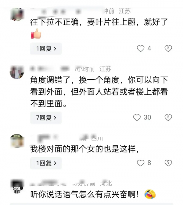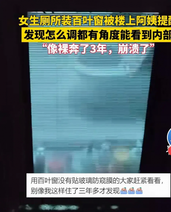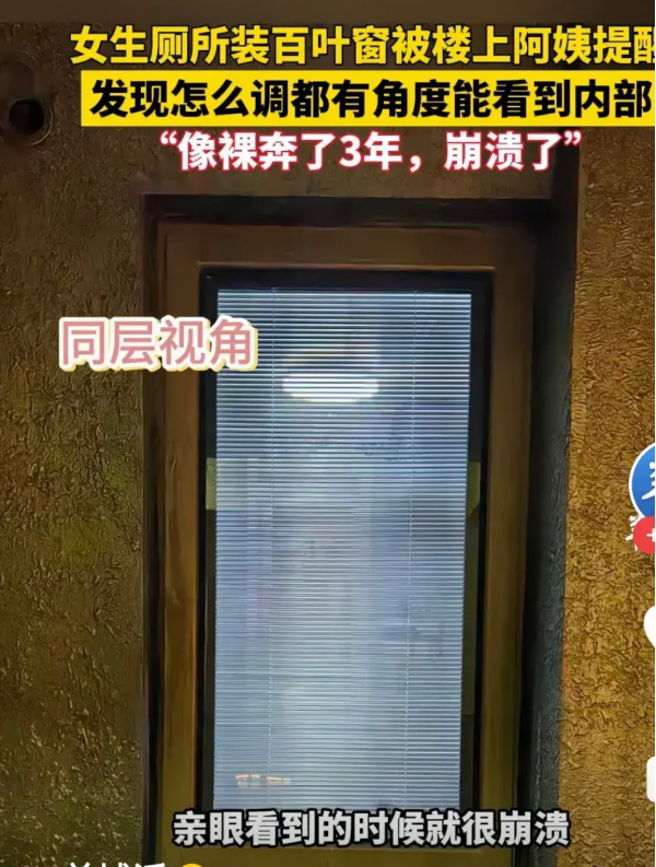 近来,一则关于百叶窗的新闻在网上热传,原来事情发生在苏州,据悉,一位在苏州生活的女子前段时间被邻居提醒,自己家的百叶窗似乎出了一些问题,于是这名女子感到非常的好奇,便立刻上了楼,没想到一上楼就发现,自家的百叶窗竟然可以清晰看到楼下的邻居家的厕所,而且这名女子也是她平时经常在家的时候,听到邻居的洗澡声就会上楼看看的人,也就是说,她在这样的百叶窗下已经裸露了3年。