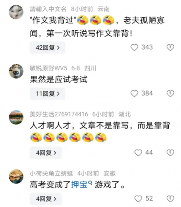有不少网友却持不同的意见。有网友说:人才啊!文章不是靠写,而是靠背?我们的高考是考什么,到底是思维,还是题海战术?考记忆力!怪不得西方人说我们作弊。
