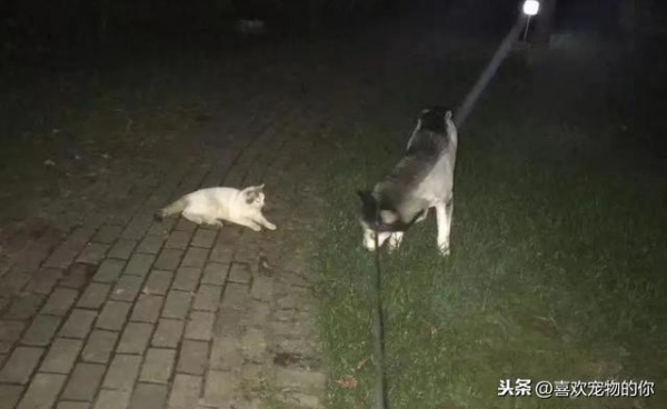 当晚小甲带着家里的狗出门散步时,这只讨食的小猫从一旁的草丛蹦了出来,陪着小甲一起遛狗。虽然是只猫,但它却丝毫不惧怕小甲的狗。