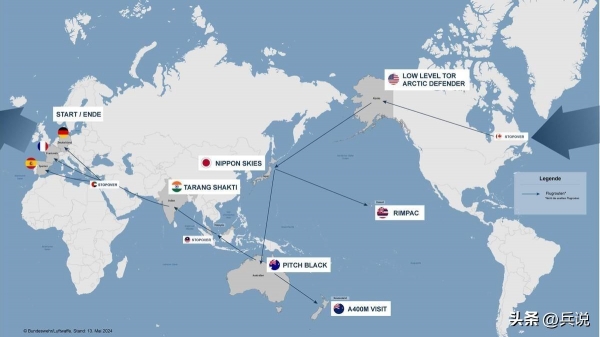 德法西三国空军并不是直奔亚太而来,他们先后在美国参加"北极卫士"军演、日本自卫队主导的"日本天空"军演;随后兵分两路,一部分参加此次"环太军演",另一部分则抵达澳大利亚,参加20国联合举行的"黑色沥青"军演。