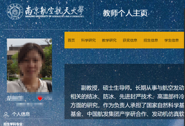 根据官网显示,胡教授的身份,是南京航空航天大学能源与动力学院副教授,硕士生导师。