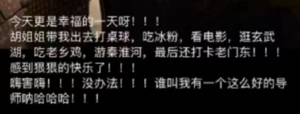 男学生在图片下配课一段文字"更是幸福的一天",他称女教授为胡姐姐,自己有一个这么好的女导师。