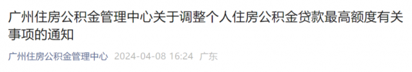4月8日,广州住房公积金管理中心发布了《关于调整个人住房公积金贷款最高额度有关事项的通知》,本通知自2024年4月9日起实施,有效期5年。