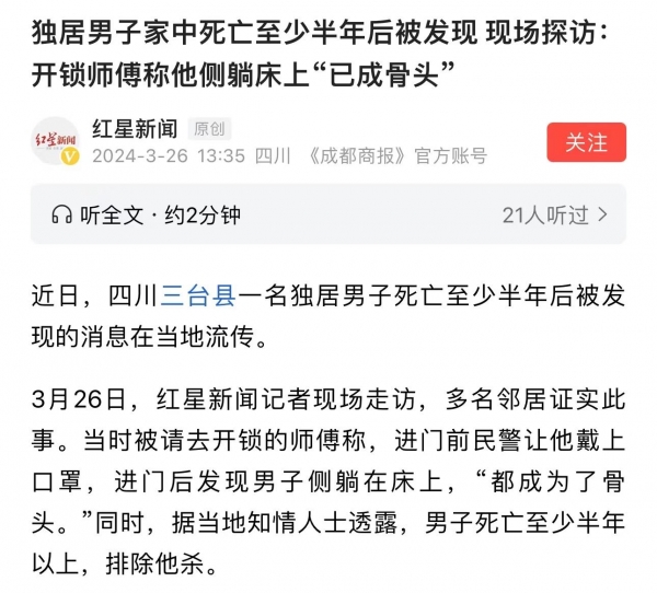 太心酸!独居男子家中死亡已成骨头,半年后才被人发现