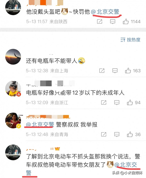 不过被网友发现双双没有带头盔,而且电动车不许两个成年座,纷纷向北京交警举报,要北京交警快罚他们。