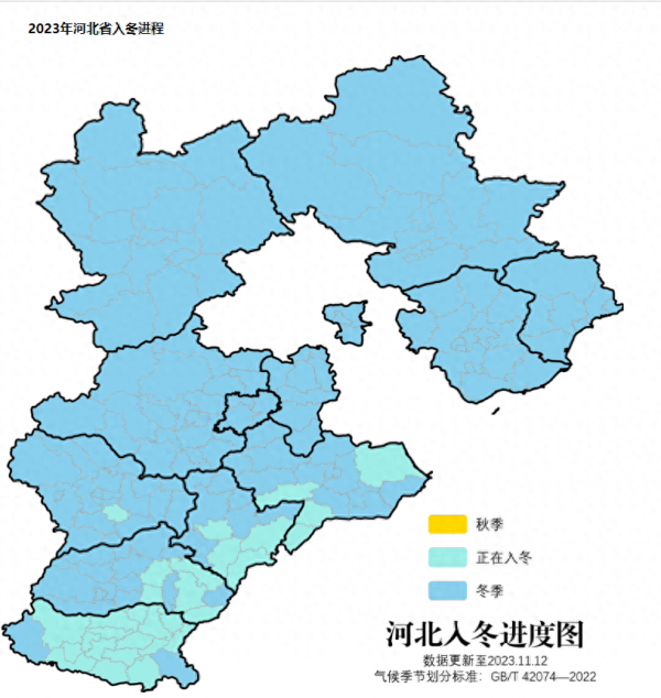 河北省气象局发布的最新天气信息显示,截至11月12日,多个城市已全域入冬,包括张家口、承德、秦皇岛、唐山、廊坊、保定、雄安新区等。石家庄、沧州、衡水、邢台等地除个别区域外也已全域入冬。