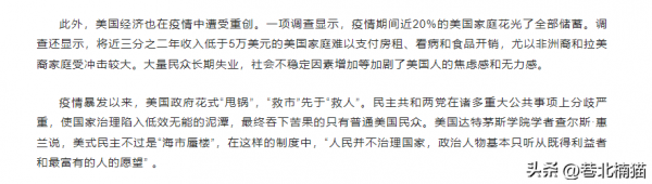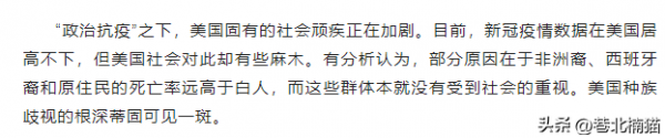 有媒体指出,美国社会对于疫情如此的漠视,是因为感染死亡人群大部分是其他有色人种,而刚好这些群体并没有收到社会的重视。