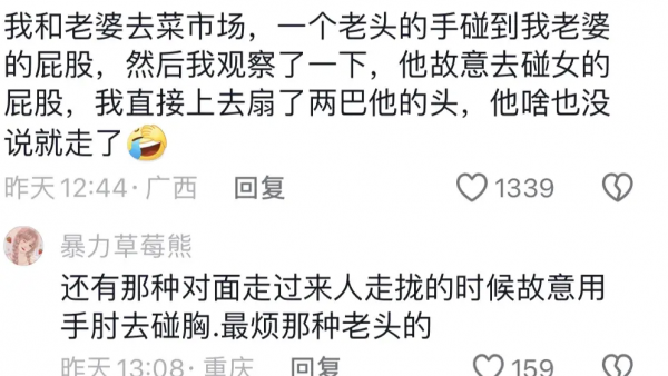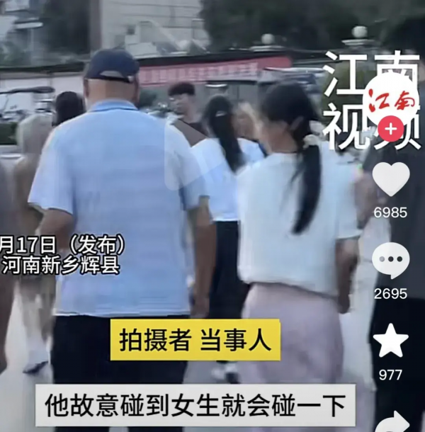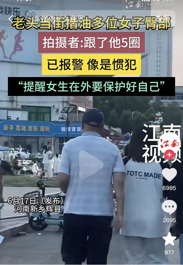 随后发现是一个老头,走路还有点颤,在摸完她之后,脸头也不回,假装"不是故意的",就那样大喇喇地甩着手走了。