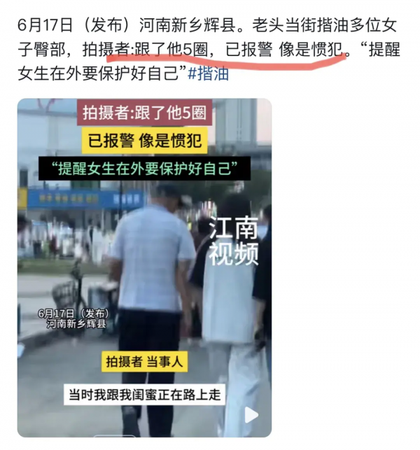 这是河南前两天的事情,起因是一个女生好端端走在路上,突然感觉自己臀部被人摸了一下,