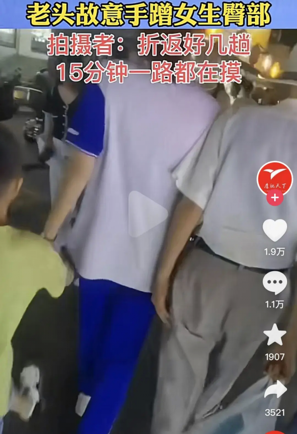 比如这位,穿着宽松地短袖,看起来很年轻,感觉只是个高中生,这老头趁其不备,手就那样摸过去,