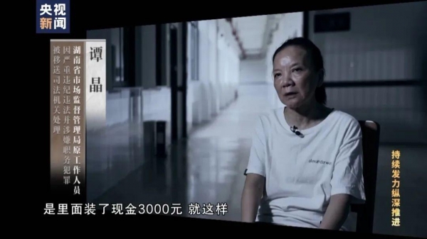 湖南省市场监督管理局原工作人员 谭晶:他就拿了一个信封,在没人的地方他就悄悄塞给我,他说是我们单位的资料。然后我回去以后发现是里面装了现金3000元,就这样。所以我不逃避我自己的(责任),犯了法要承担法律的责任,一定要。