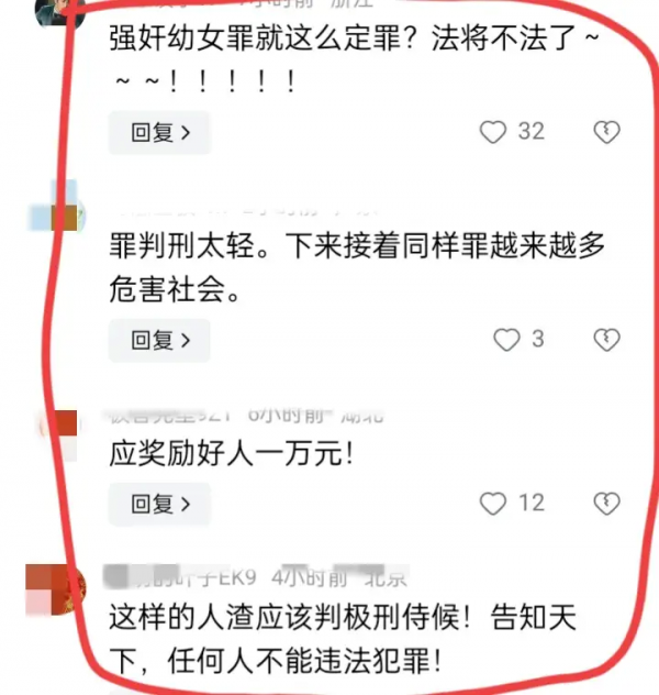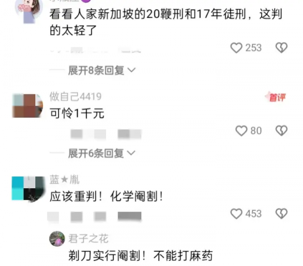 还有网友表示:看看人家新加坡的20鞭刑和17年徒刑,这判的太轻了。应该重判!化学阉割!化学或者物理阉割才对。