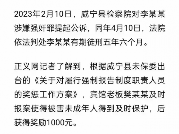 2023年2月10日,威宁县检察院对李某某提起公诉。同年4月10日,法院依法判处李某某有期徒刑五年六个月。这一判决结果虽然让不少网友感到"判得太轻",但也再次向全社会传递了一个明确的信息:任何侵害未成年人的行为都将受到法律的严惩。