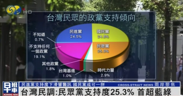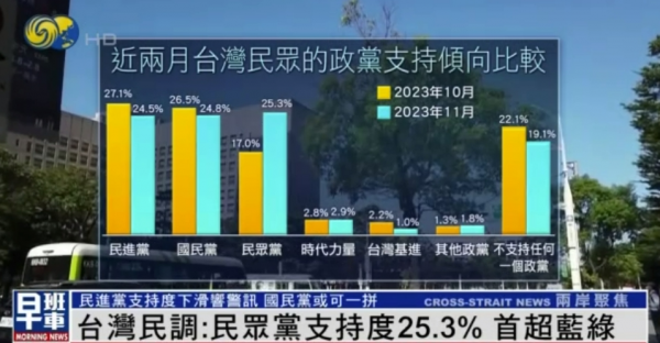 台湾民调:民众党支持度25.3%,首超蓝绿