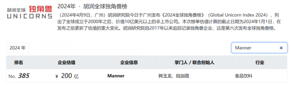 据《2024胡润全球独角兽榜》,Manner以200亿元的估值排在榜单第385位。