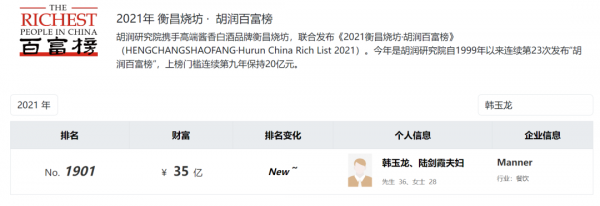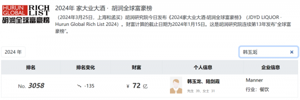与此同时,Manner创始人韩玉龙、陆剑霞夫妇的财富也在迅速膨胀。2021年,韩玉龙、陆剑霞夫妇以35亿的身家首次登上《胡润百富榜》,而到2023年,他们的身家已经翻了一倍,达到了70亿元。2024年,Manner咖啡创始人39岁的韩玉龙和31岁的陆剑霞夫妇以72亿元身家排在《2024胡润全球富豪榜》榜单第3058位。