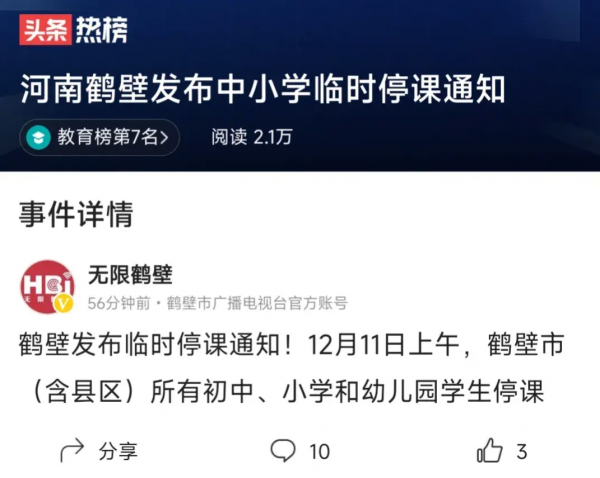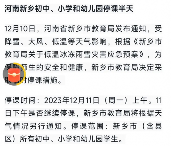 受到降雪影响,12月11日河南多地发布停课通知。