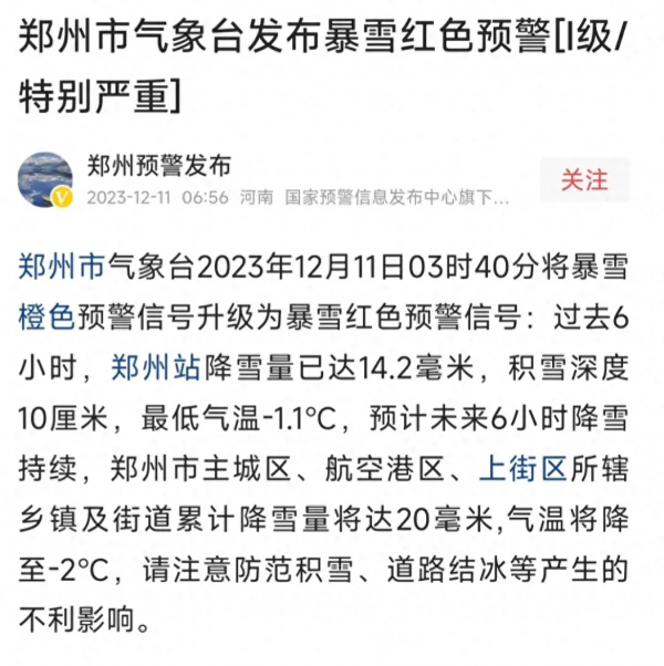 12月11日郑州气象台发布了暴雪红色预警。