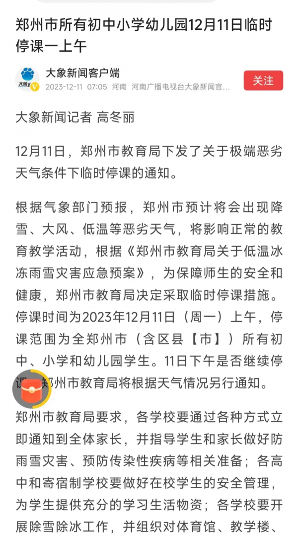 河南郑州教育局发布停课,停课一上午,下午是否上课根据天气情况另行通知。