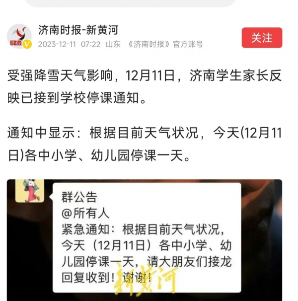 除了河南多地停课,山东济南有家长反馈也接到了学校临时停课通知,停课一天。