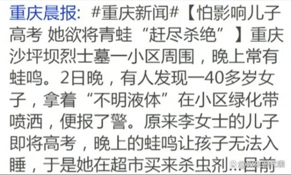 更有甚者,重庆一位母亲发现自家小区周围经常有蛙鸣,竟然去超市购买了杀虫剂,打算将绿化带里的青蛙进行灭口;也有人禁止小区安装空调,只要有人安装,就一盆凉水泼过去。