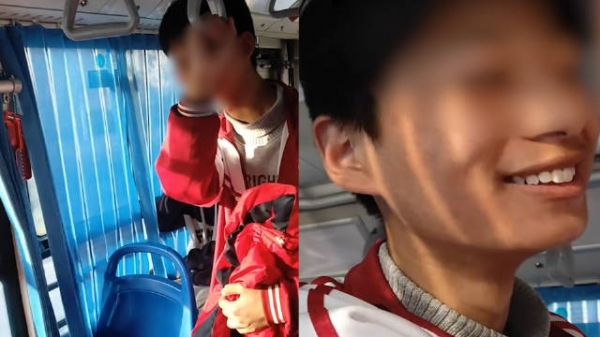 视频中男孩扶着扶手站在座位旁,大爷拍着视频问他哪个学校,随后镜头环视全车,多次夸赞男孩并向其表示感谢,男孩也一直面带微笑害羞但礼貌的回答着大爷的问题。