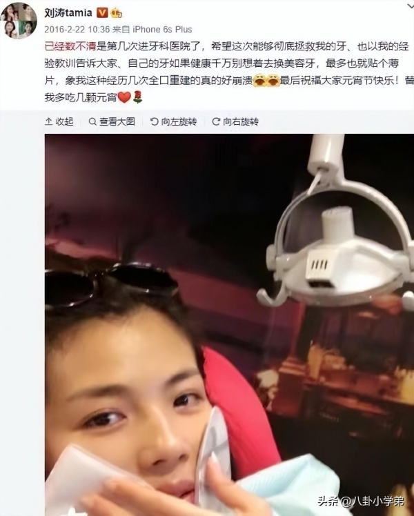 刘涛的烤瓷牙可是下了血本,全套下来300万,真正的"一牙千金",完全是镶了一套房在嘴里。既受了折磨,又烧了钱,没想到刘涛的"整牙之旅"才刚刚开始,烤瓷牙三天两头的"造反",刘涛也已经数不清自己是第几次进牙科医院了。