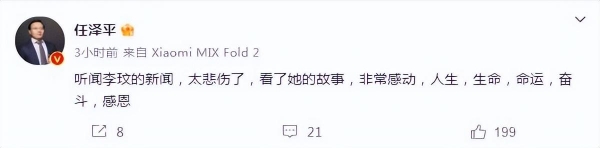 内地演员王宝强留言道:"跑完路演,听闻李玟姐去世的消息还是不敢相信。有的时候生命真的很脆弱,脆弱的让人心疼,需要真正的关爱好好呵护。Coco姐,希望天堂只剩美好,不会再有任何烦恼"。