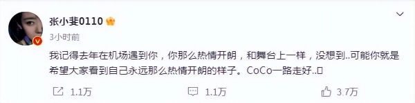 内地喜剧女星张小斐留言说:"我记得去年在机场遇到你,你那么热情开朗,和舞台上一样,没想到..可能你就是希望大家看到自己永远那么热情开朗的样子。CoCo一路走好"。