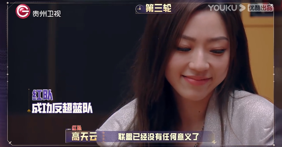 这个姐很聪明,本来跟蓝队是同盟,但很快意识到绿队必赢,在三进二的机制下唯一能救自己队的方式就是跟蓝队争剩下的一个名额,即便红队比蓝队分低,但差距不大。