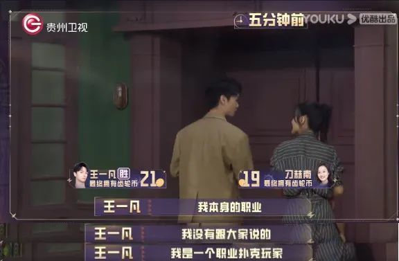 最后用心理战淘汰了对方,结束后才告知自己是职业的扑克选手,这个游戏对自己比较有优势。