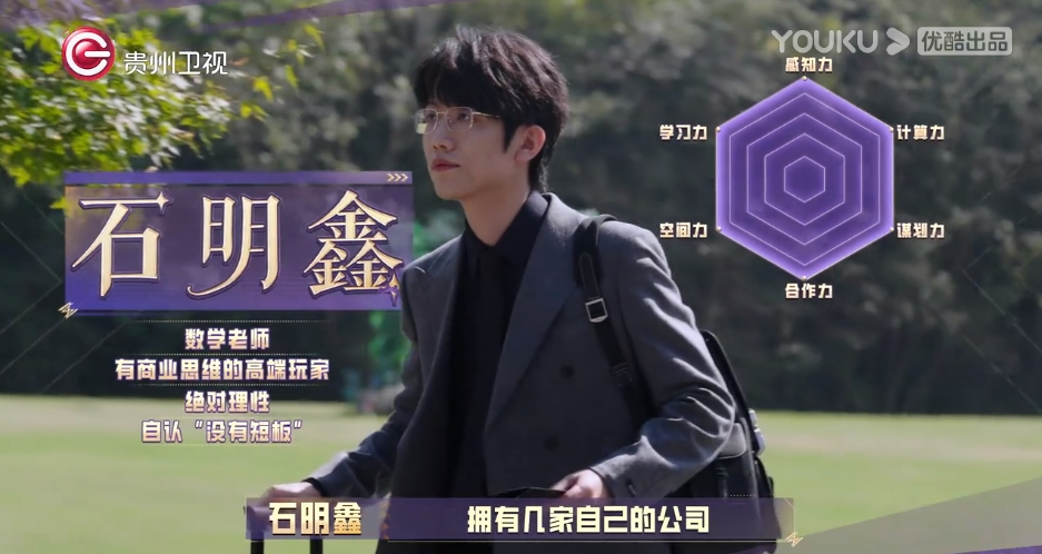 石明鑫,27岁,白手起家从事青少年思维开发和数学相关工作,现在是多家公司的CEO,曾是《最强大脑第十季》的亚军,现在又来挑战参加《超机智青年大会》。