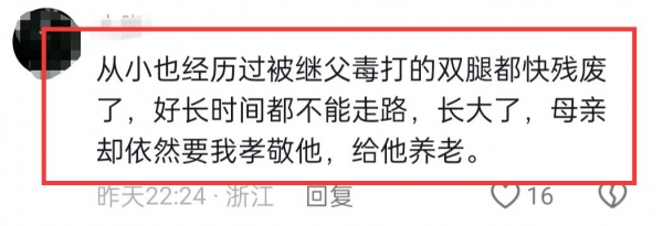 有网友表示,从小也经历过被继父毒打,双腿都快残废了,好长时间都不能走路,长大了,母亲要求他给继父养老!