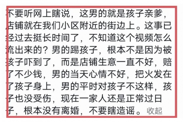据这位网友爆料,这男子就是女孩的亲爹,而且这事已经过去一段时间了,男子做出这样的动作的根本原因,并不是因为被儿女吓到后生气才发飙,而是因为生意难做,赔了钱,心情本就不好,女儿一下子成为了他的出气筒。