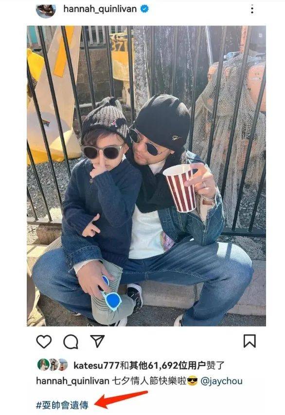 昆凌上传的则是老公与儿子罗密欧的合影,父子俩都戴着墨镜,罗密欧用一根手指扶着自己的墨镜,昆凌忍不住加标签调侃:"耍帅会遗传"。