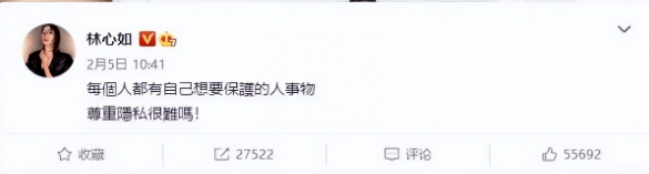 林心如和霍建华此前对女儿保护严密,没在社交平台晒过她的正脸照,只是偶尔晒出一些背影或侧脸的照片。对于女儿长相的泄露,林心如很生气,在微博很不爽地写下:"每个人都有想要保护的人事物,尊重隐私很难吗?"指责网友不尊重个人隐私权。
