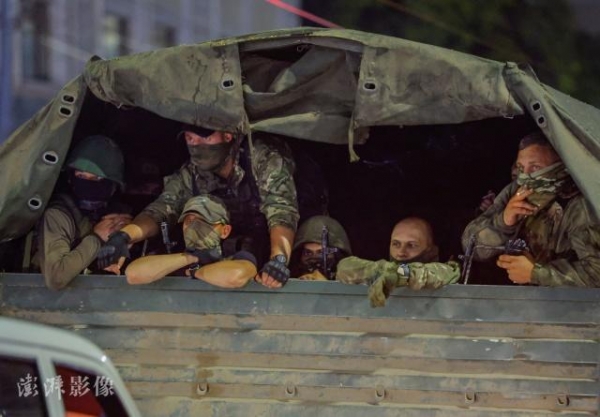 当地时间6月24日,瓦格纳集团武装人员离开顿河畔罗斯托夫的俄南部军区司令部 图源:澎湃影像