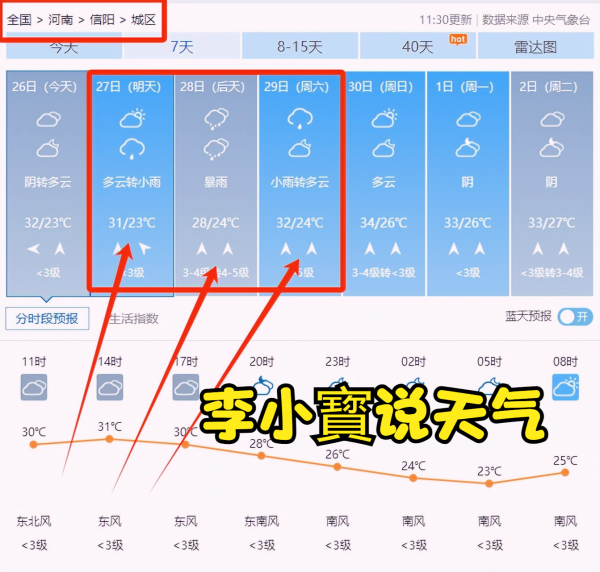 咱们再来看看未来七天的天气具体是个啥情况。今天下午到晚上,南部地区多云,信阳南部还可能有阵雨、雷阵雨;其他地方就晴天间多云了。明天呢,南部地区多云到阴天,大部分地区都有阵雨、雷阵雨;其他地方就晴天到多云了。