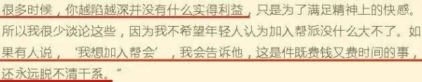 另外卡姐还呼吁当下的年轻人不要像她一样随便加入帮派,不仅会越陷越深还得不到什么实际利益,费时间费钱,还永远也脱不清干系。