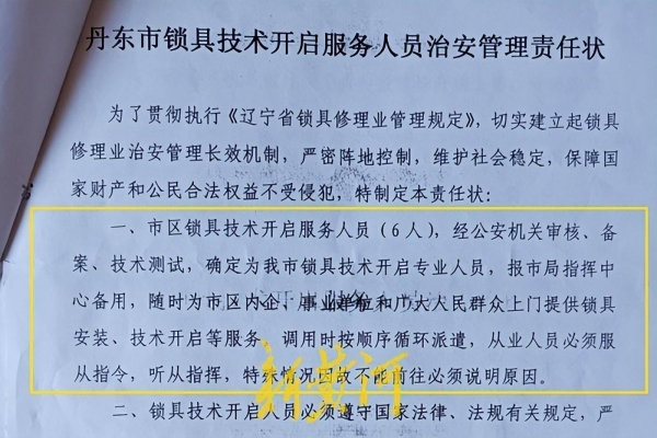 在这份《责任状》中,记者看到其中载明"市区锁具技术开启服务人员(6人),经公安机关审核、备案、技术测试,确定为我市锁具技术开启专业人员,报市局指挥中心备用,随时为市区内企、事业单位和广大人民群众上门提供锁具安装、技术开启等服务。调用时按顺序循环派遣,从业人员必须服从指令,听从指挥,特殊情况因故不能前往必须说明原因。"在这份《责任状》的落款,盖有丹东市公安局治安管理支队特业科的公章,以及王立军的签名。