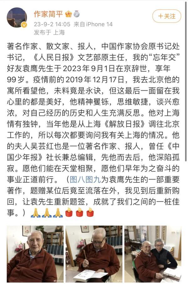 对于袁老的离世,作家简平发长文悼念,"曾去北京看望他,未料竟是永诀","但这最后一面留在我心里的都是美好,他精神矍铄,思维敏捷,对自己经历的历史和人生充满反思"。
